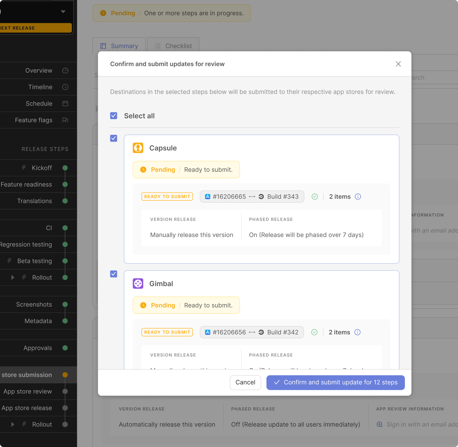 - Monitor all apps and releases in a unified place: View release status, build info, app store updates, rollout progress, and key data for a complete org-wide overview. Summary views combine information for apps sharing workflows, eliminating tab-switching across App Store Connect, Google Play Console, and the rest of the release toolchain.
