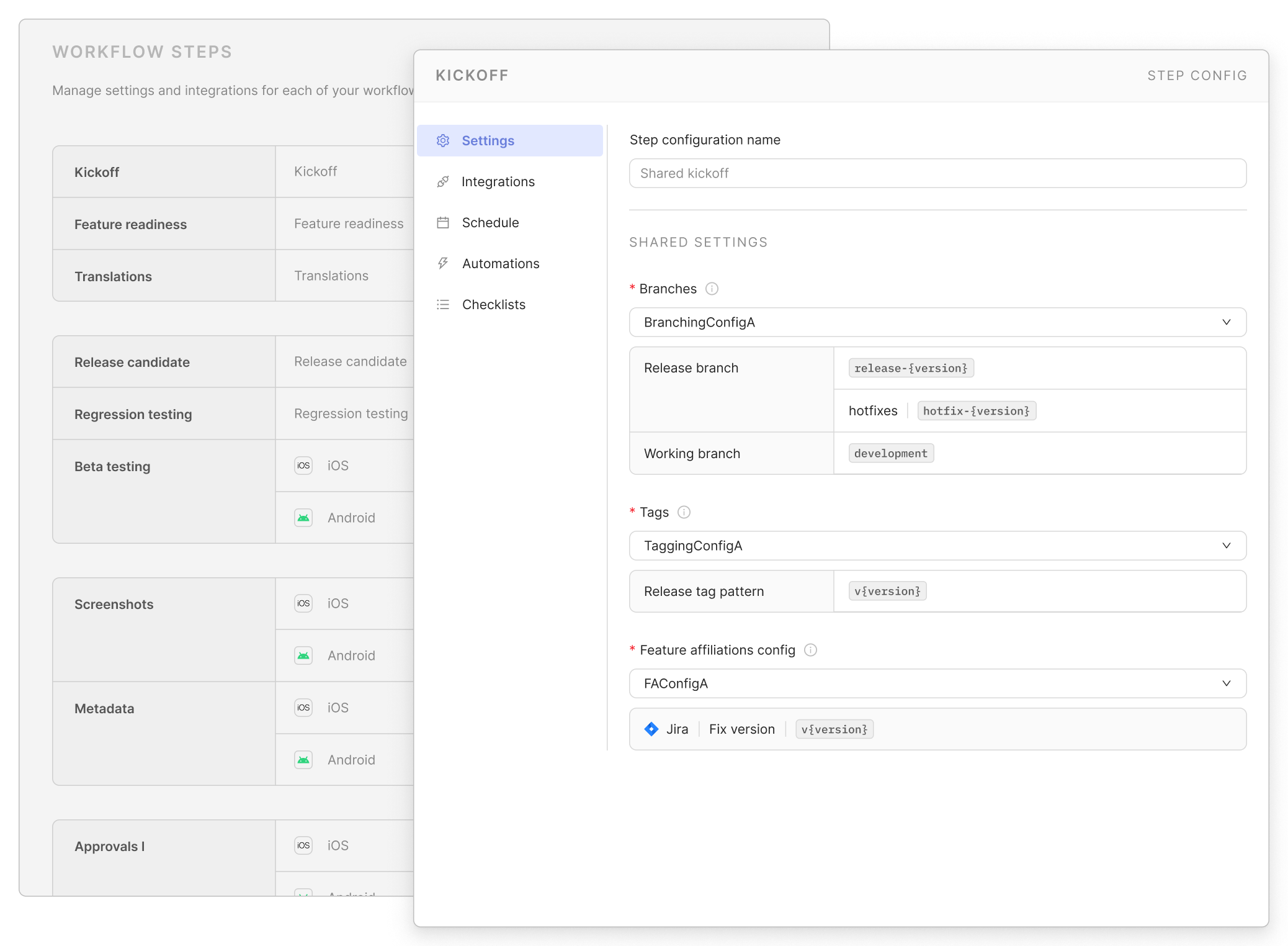 - Define a release blueprint once, reuse as needed: Configure a centralized definition of your release process and apply it across multiple apps, while still leaving room for one-offs and app-specific behavior where needed. Codify standard practices through shared settings for schedules, automations, and safeguards to boost efficiency and reduce tech debt.